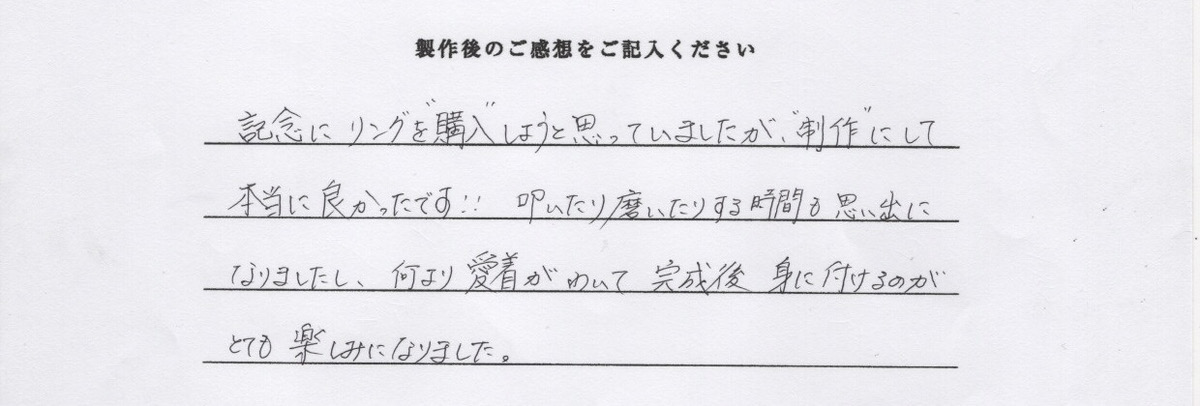 記念にリングを”購入”しようと思っていましたが、”制作”にして本当に良かったです!!叩いたり磨いたりする時間も思い出になりましたし、何より愛着が湧いて完成後身につけるのがとても楽しみになりました。