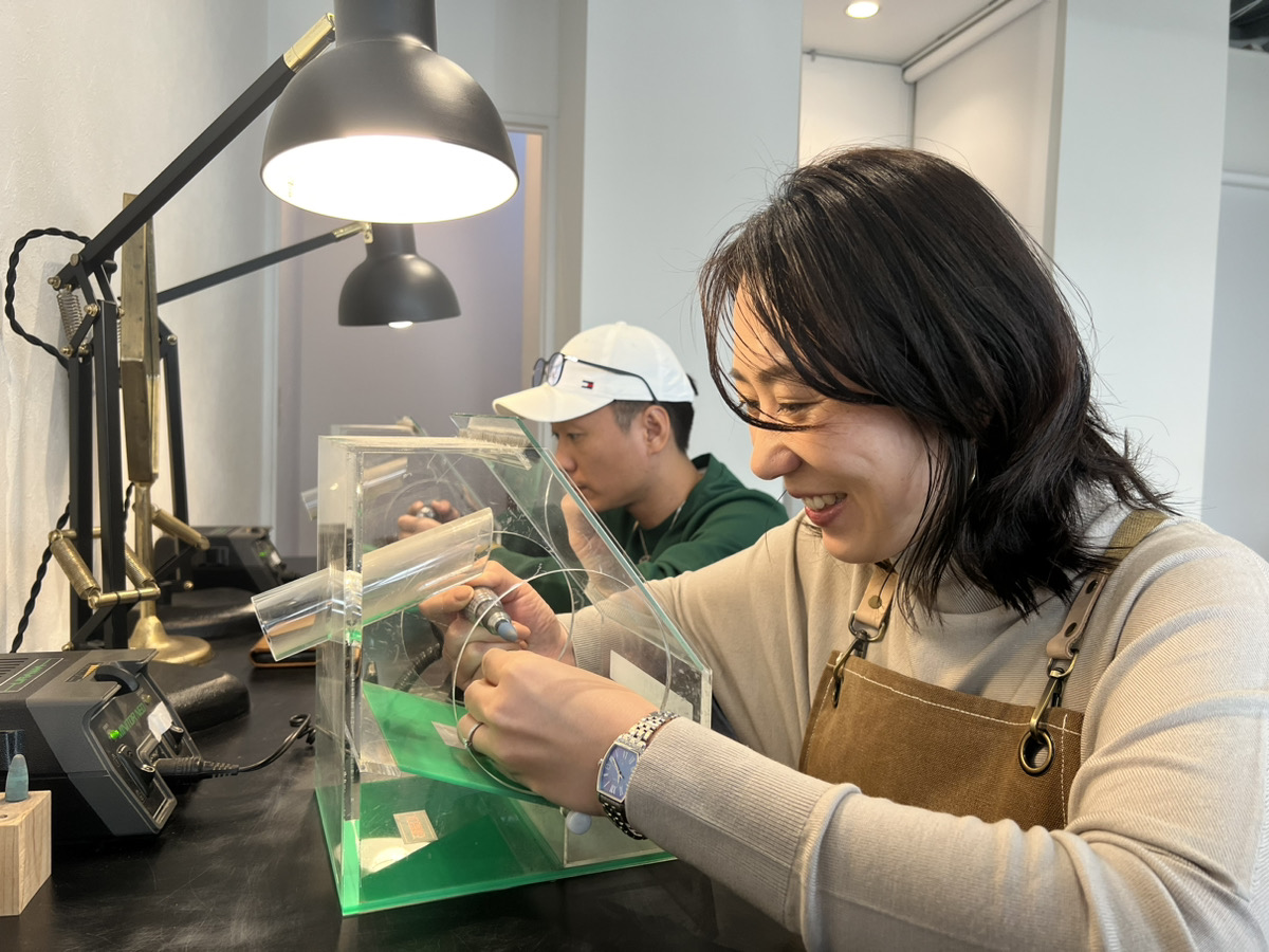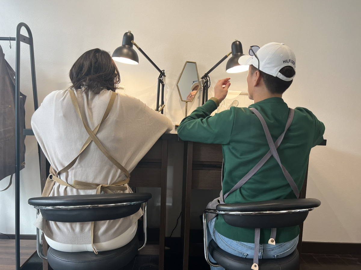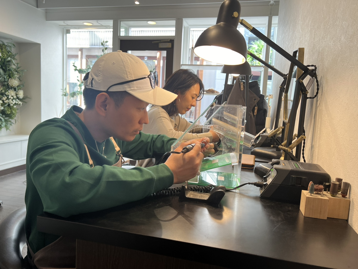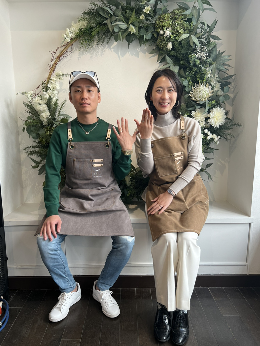 ピンキーリングがセットになった季節限定の特別なコースをお選びいただきました。お互いのリングを交換してご制作いただいたのですが、お相手様を思いながら丁寧に作業される様子にとても温かい気持ちになりました。お子様ふたりのお名前が内側に刻印されたリング、愛情が詰まっていてとても素敵ですね。
