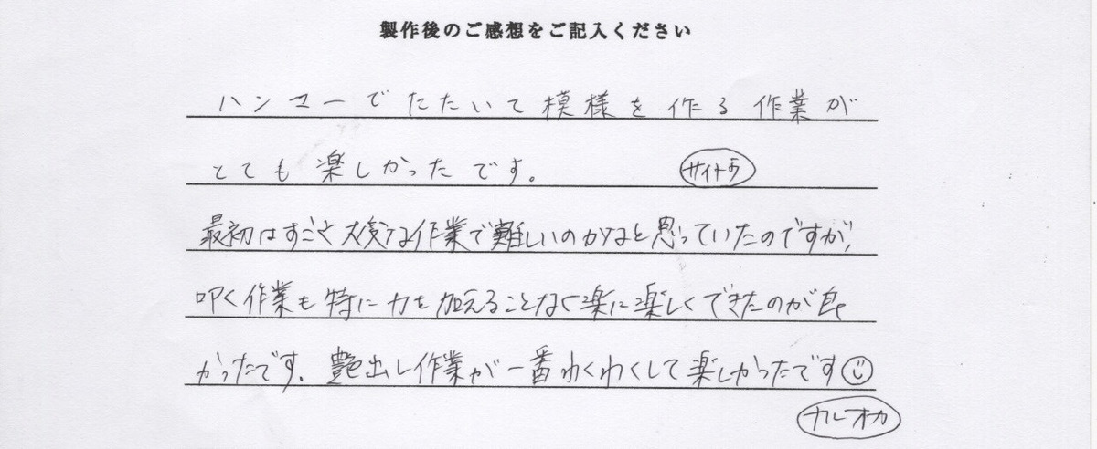 ハンマーでたたいて模様を作る作業がとても楽しかったです。