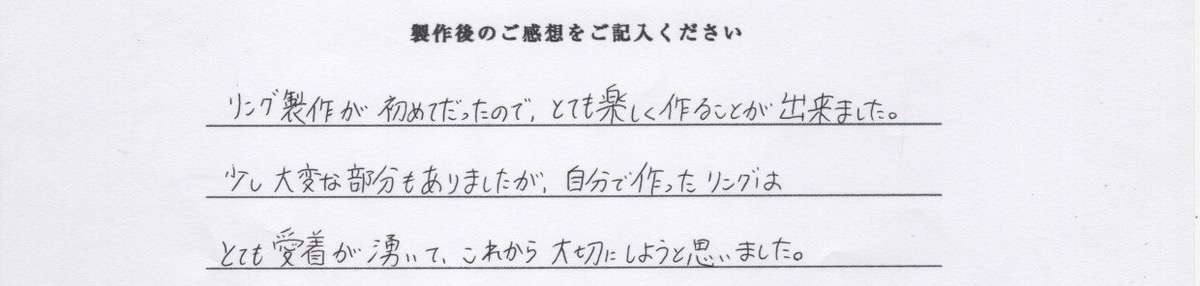 少し大変な部分もありましたが、自分で作ったリングはとても愛着が湧いて、これから大切にしようと思いました。