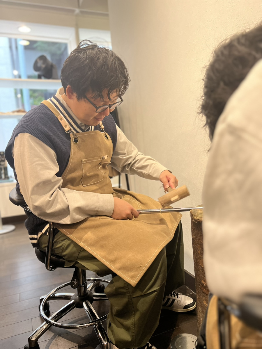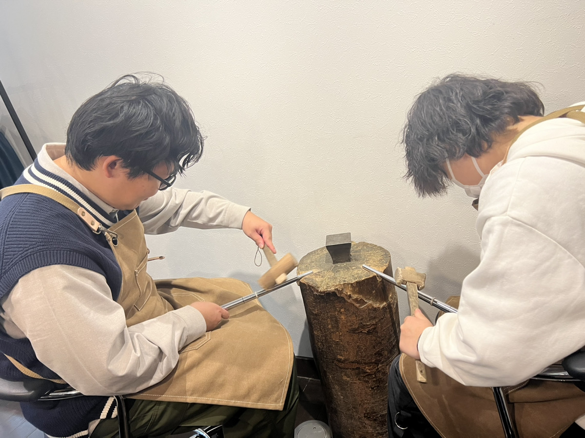 4mm幅で艶のあるシルバーリングをお作りいただきました。幅がしっかりしているリングはハンマーで叩く作業が少し大変だったと思いますが、おふたりとも頑張って最後まで叩いてくれました。歪みもなくとても綺麗な形に叩けていましたね。