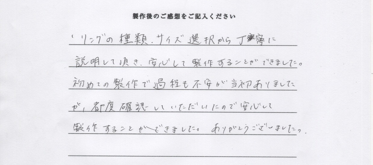 リングの種類、サイズ選択から丁寧に説明して頂き、安心して制作することができました。初めての製作で過程も不安が当初ありましたが、都度確認していただいたので安心して製作することができました。ありがとうございました。