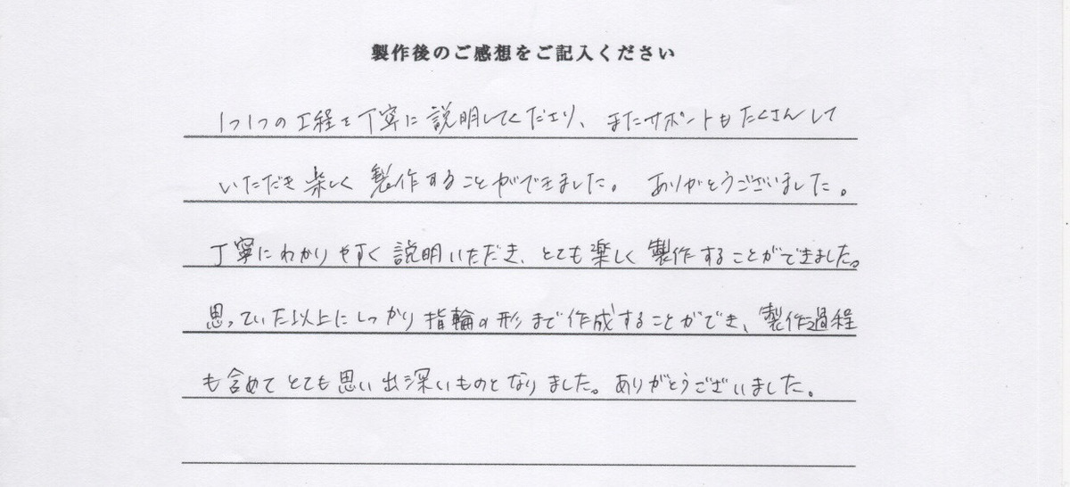 丁寧にわかりやすく説明していただき、とても楽しく製作することができました。思っていた以上にしっかり指輪の形まで作成することができ、製作過程も含めてとても思い出深いものとなりました。