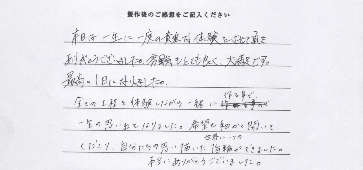 全ての工程を体験しながら、一緒に作ることで、一生の思い出となりました。希望も細かく聞いてくださり、自分たちの思い描いた世界に一つの指輪ができました。本当にありがとうございました。