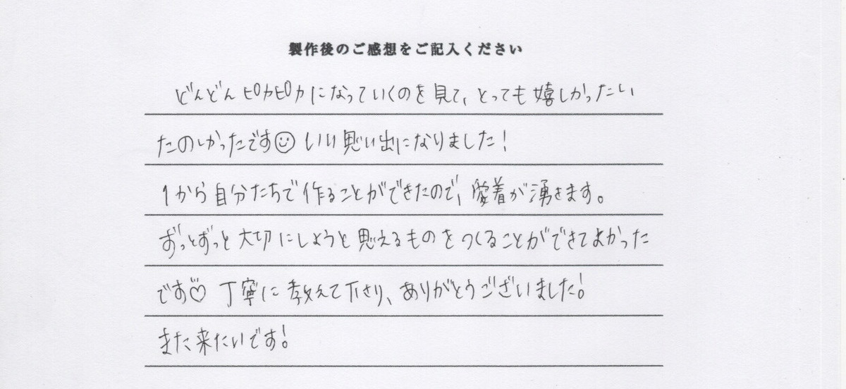 ずっとずっと大切にしようと思えるものをつくることができてよかったです!丁寧に教えて下さり、ありがとうございました!