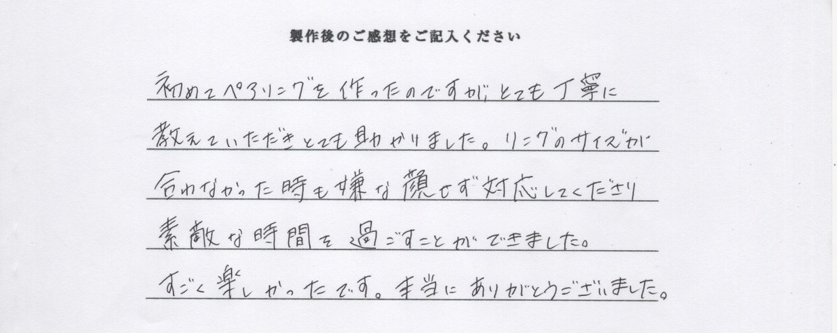 初めてペアリングを作ったのですが、とても丁寧に教えていただきとても助かりました。リングのサイズが合わなかった時も嫌な顔せず対応してくださり、素敵な時間を過ごすことができました。