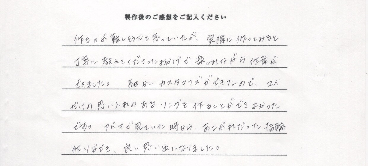 細かいカスタマイズができたので、2人だけの思い入れのあるリングを作ることができよかったです。
