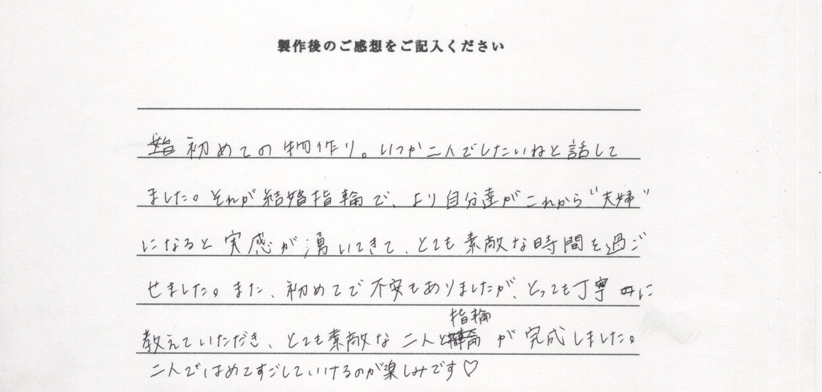 初めての物作り。いつか二人でしたいねと話してました。それが結婚指輪で、より自分たちがこれから”夫婦”になると実感が湧いてきて、とても素敵な時間を過ごせました。また、初めてで不安もありましたが、とっても丁寧に教えていただき、とても素敵な二人の指輪が完成しました。