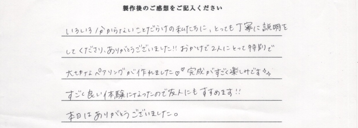 いろいろ分からないことだらけの私たちに、とっても丁寧に説明をしてくださり、ありがとうございました!!おかげで2人にとって特別で大切なペアリングが作れました!完成がすごく楽しみです!