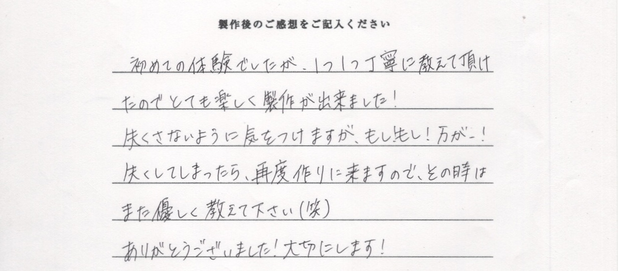 初めての体験でしたが、1つ1つ丁寧に教えて頂けたのでとても楽しく制作が出来ました!