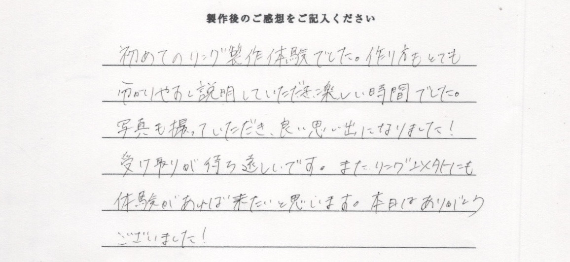 受け取りが待ち遠しいです。またリング以外にも体験があれば来たいと思います。本日はありがとうございました!
