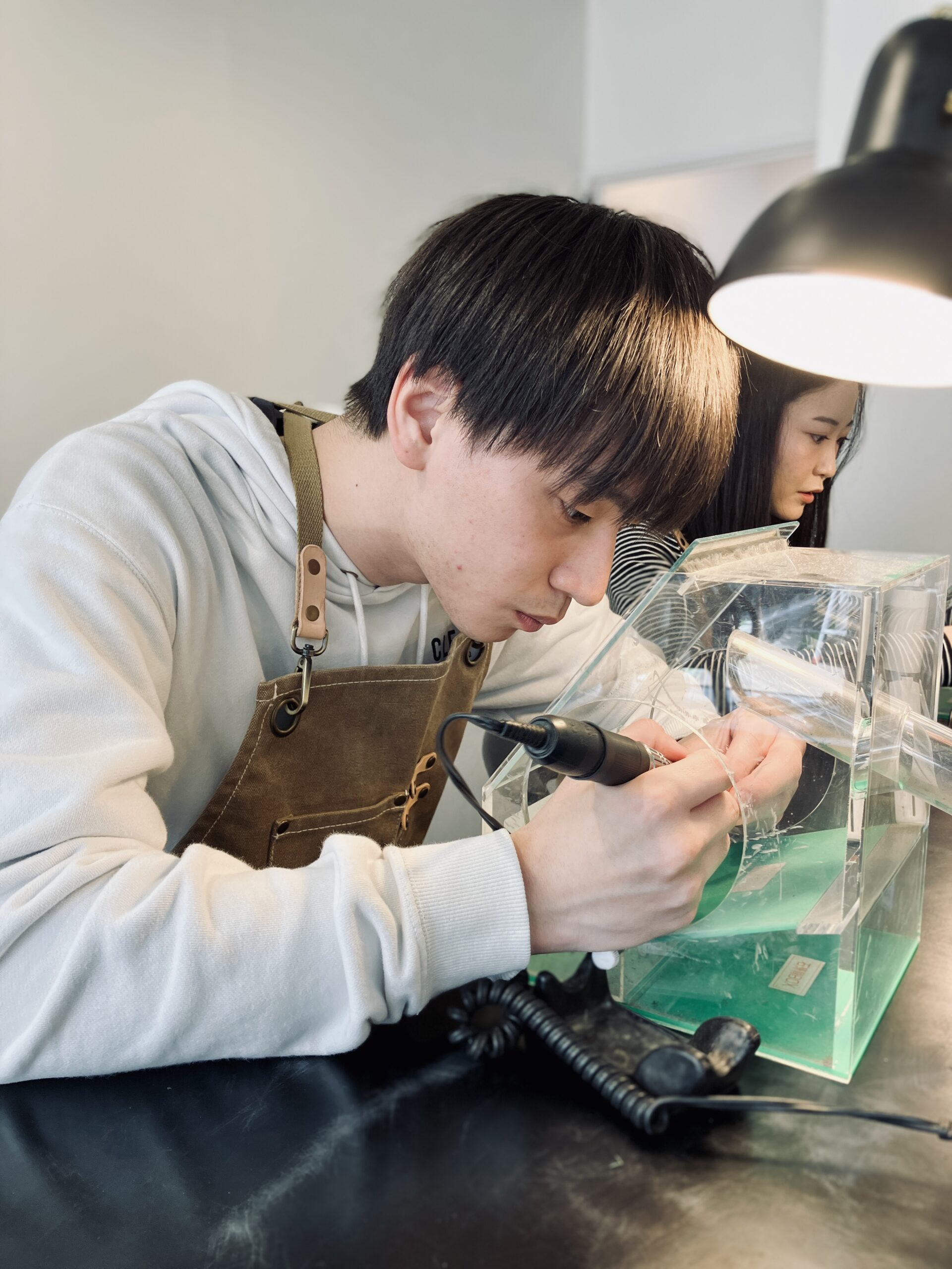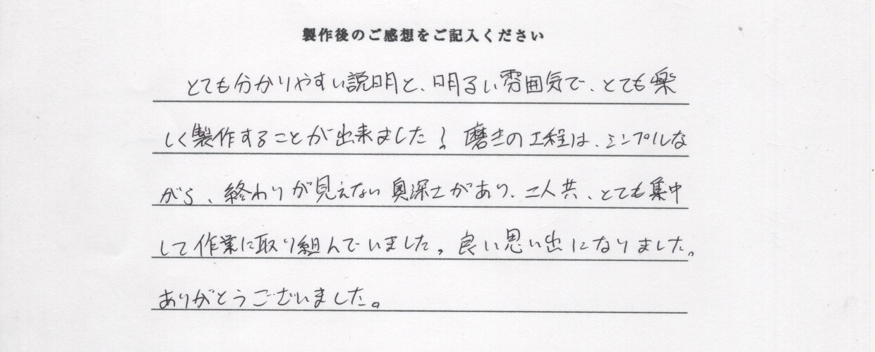 とても分かりやすい説明と、明るい雰囲気で、とても楽しく制作することができました!磨きの工程は、シンプルながら、終わりが見えない奥深さがあり、二人共とても集中して作業に取り組んでいました。良い思い出になりました。