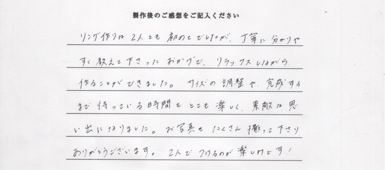 リング作りは2人とも初めてでしたが、丁寧に分かりやすく教えて下さったおかげで、リラックスしながら作ることができました。