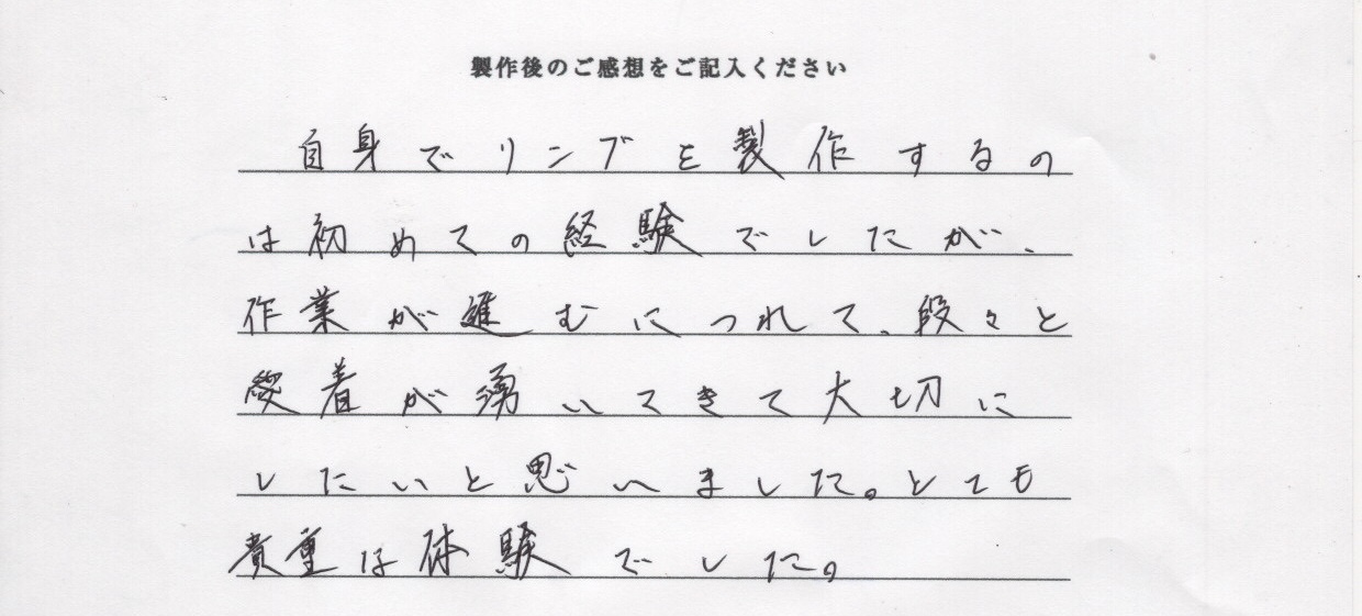 それぞれご自身のリングを制作されましたが、お互いの進捗状況を確認しながら、楽しんで作っていただいたようで嬉しく思います。ぜひ末永くご愛用くださいませ。