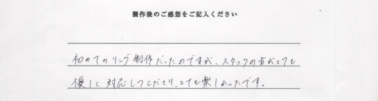 初めてのリング制作だったのですが、スタッフの方がとても優しく対応してくださり、とても楽しかったです。