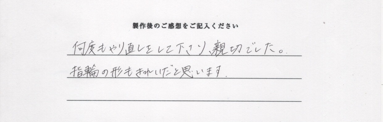 サイズ感を迷われていたので、何度も様子をみて調整をさせていただきました。最終的にはお二人にぴったりのサイズで、綺麗なリングになりました。加工でお預かりしますので、最終の仕上がりを楽しみにお待ちくださいませ。