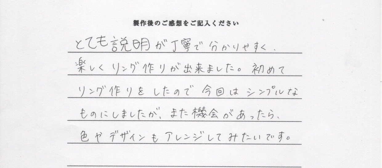 初めてのリング制作、楽しんでいただけたようで嬉しく思います。是非また違うデザインにもチャレンジしにいらしてください。心よりお待ちしております。