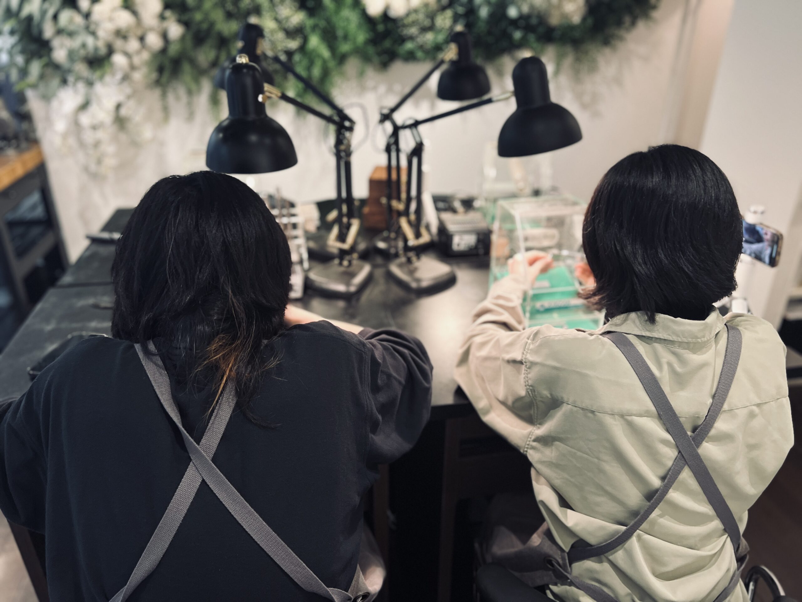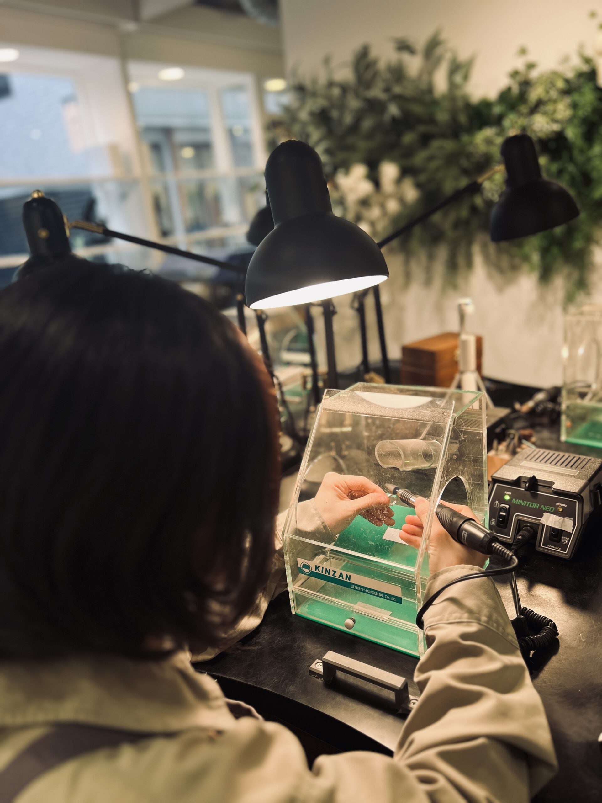 今回はご自身のリングを制作されましたが、お互いの進捗状況を見せ合いながら、進めていらっしゃいました。丁寧に磨きをかけていただいたので、とても綺麗な鏡面になりました。ジュエリープロテクトと石留めの加工を承りましたので、納品までしばらくお時間をいただきますが、楽しみにお待ちくださいませ。