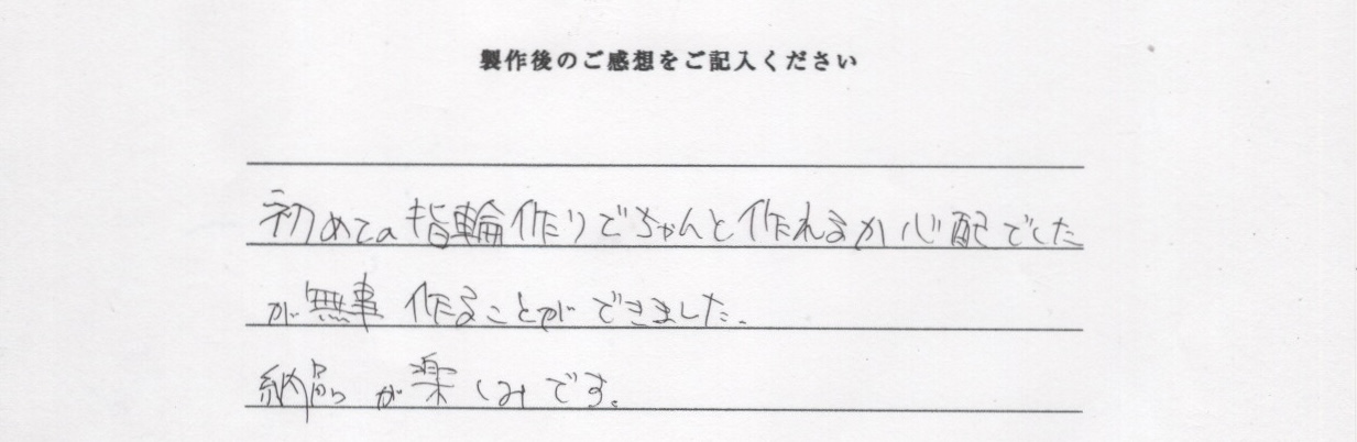 初めての指輪作りでちゃんと作れるか心配でしたが無事作ることができました。