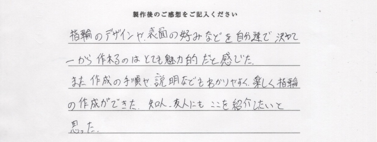 また、作成の手順や説明などもわかりやすく、楽しく指輪の作成ができた。知人、友人にもここを紹介したいと思った。