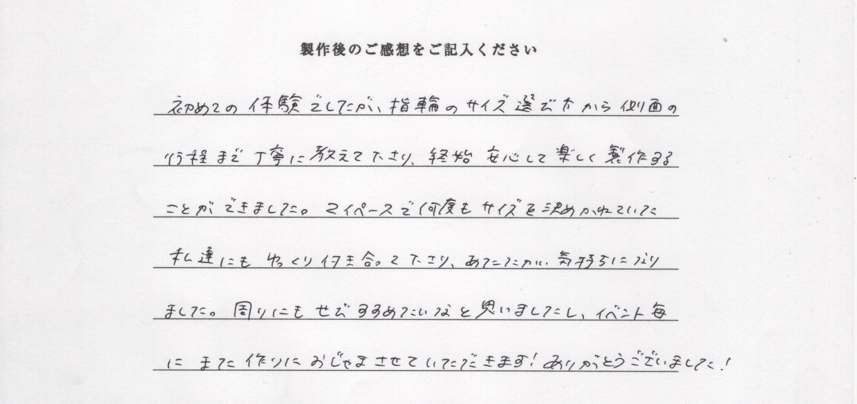 初めての体験でしたが、指輪のサイズ選びから丁寧に教えて下さり、終始安心して楽しく制作することができました。