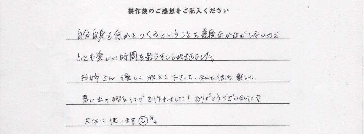 お姉さん優しく教えて下さって、私も彼も楽しく思い出の残るリングを作れました!ありがとうございました!