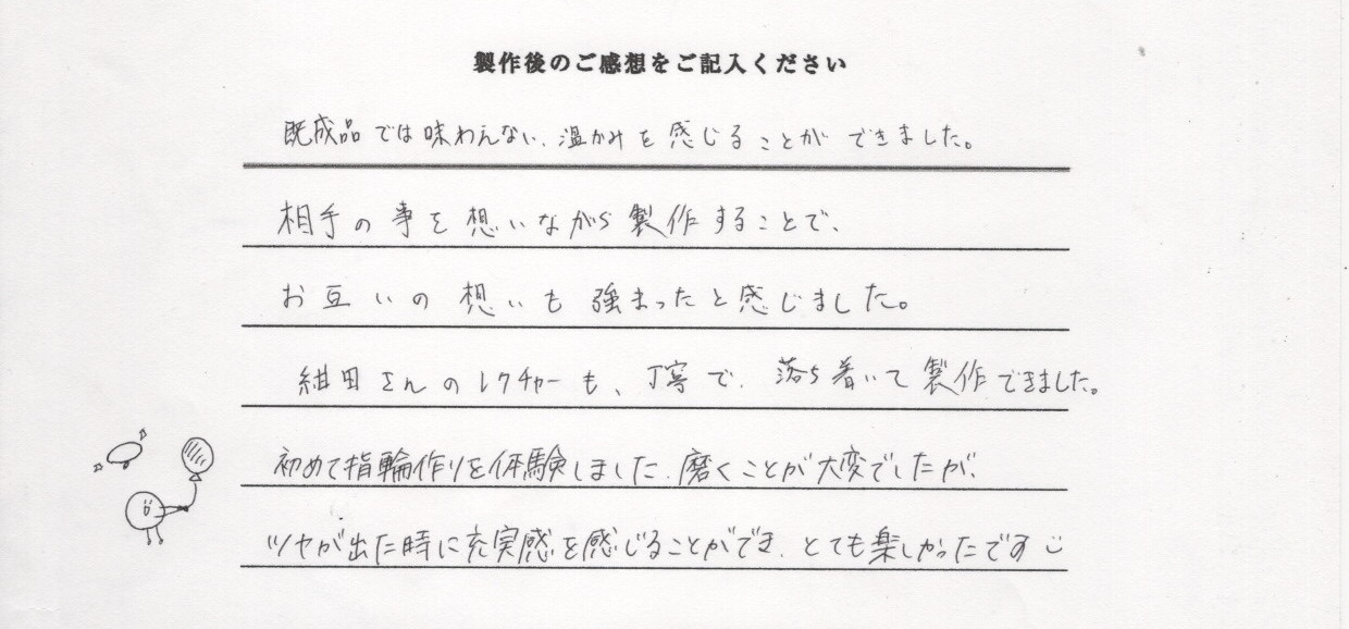 既製品では味わえない温かみを感じることができました。相手の事を想いながら制作することで、お互いの想いも強まったと感じました。