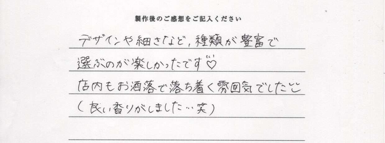 お好きなデザインを選んで制作していただくことができ、気に入っていただけたようで嬉しく思います。末長くご愛用くださいませ。