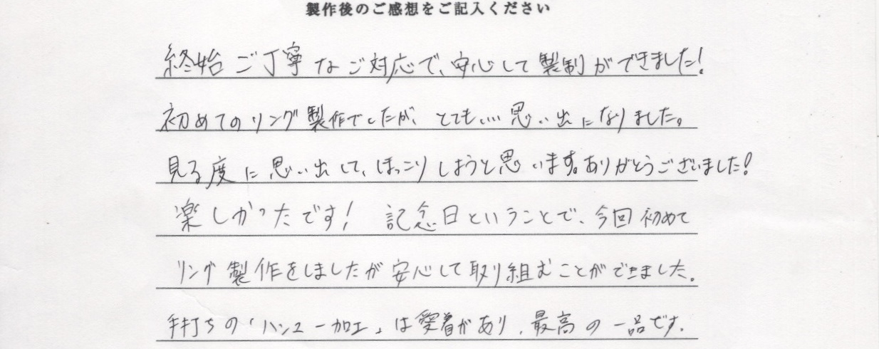 おふたりにとって初めての手づくりペアリング制作を、楽しい思い出にしていただけたようで大変嬉しいです。