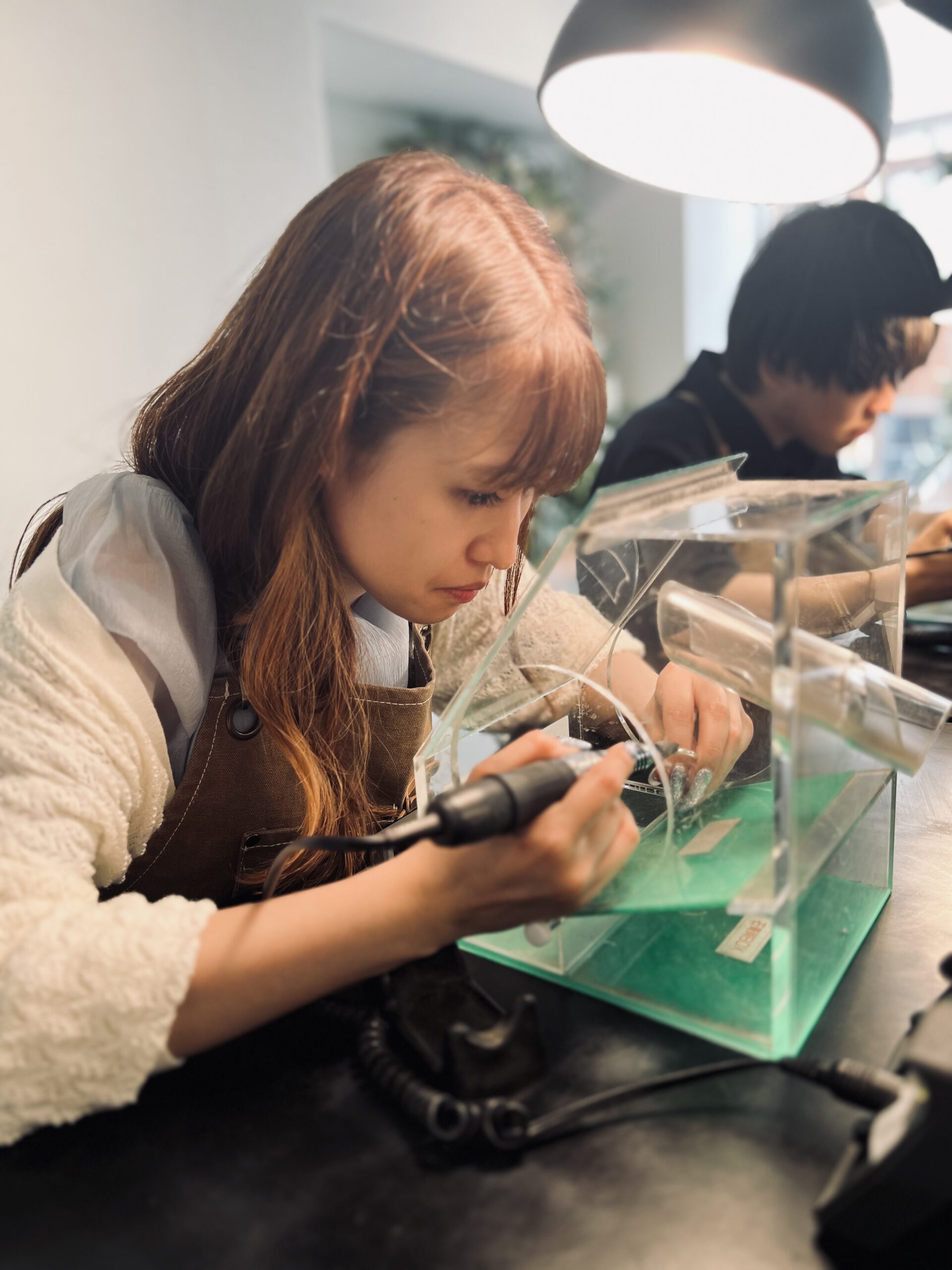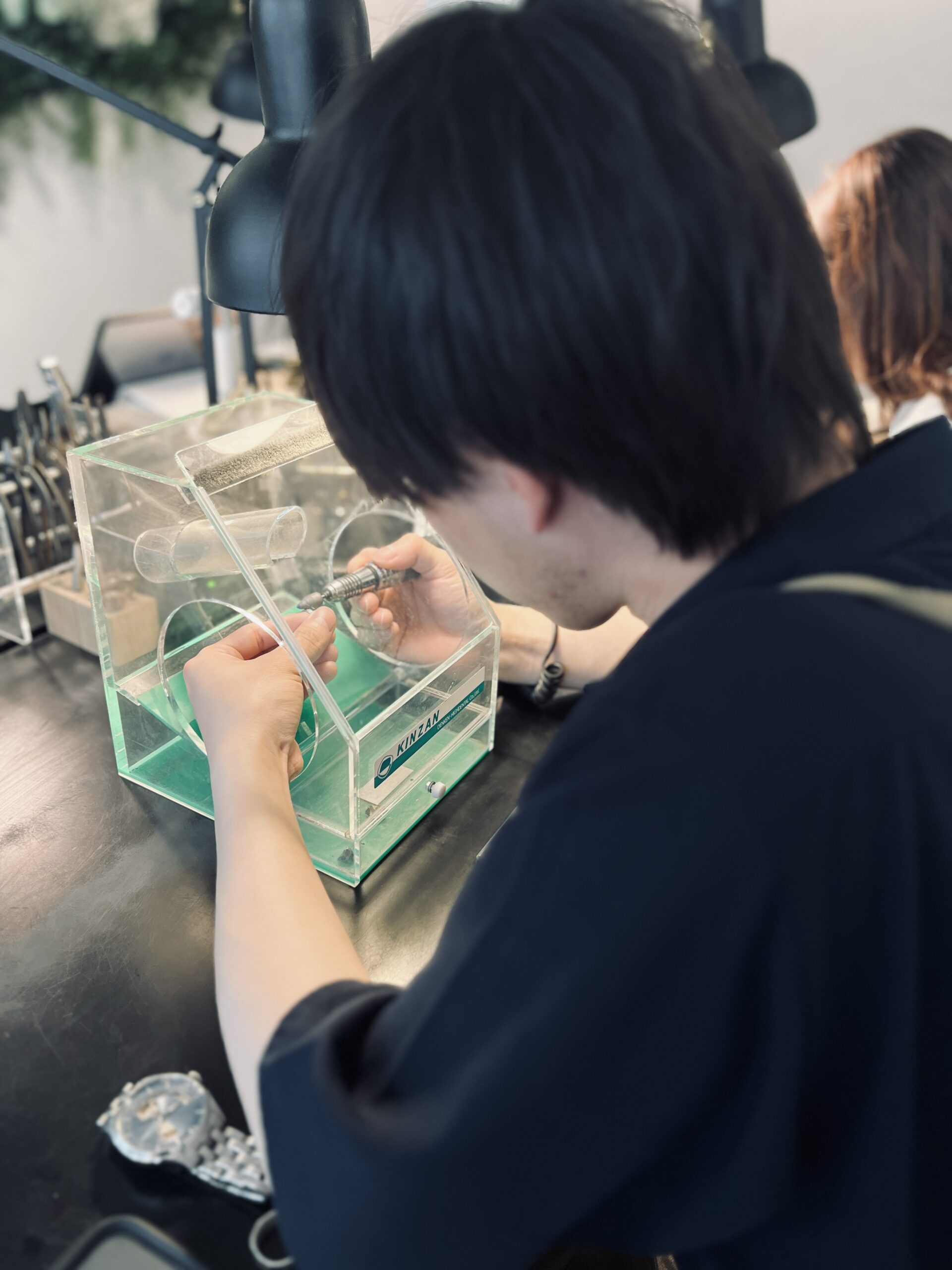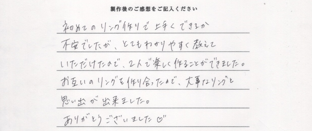 初めてのリング作りで上手くできるか不安でしたが、とてもわかりやすく教えていただけたので、2人で楽しく作ることができました。お互いのリングを作り合ったので、大事なリングと思い出が出来ました。