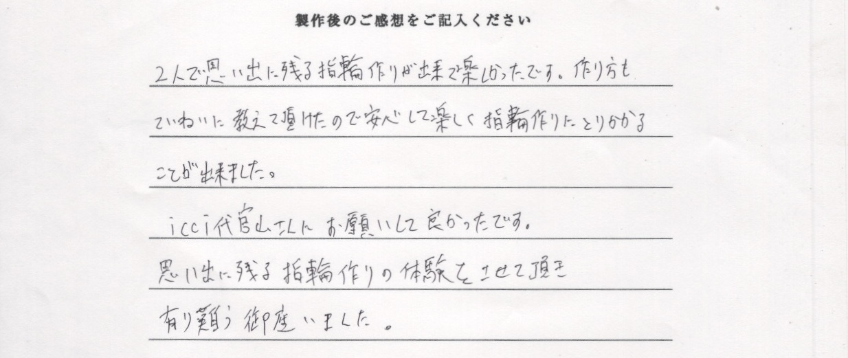 2人で思い出に残る指輪作りが出来て楽しかったです。作り方もていねいに教えて頂けたので安心して楽しく指輪作りにとりかかることが出来ました。