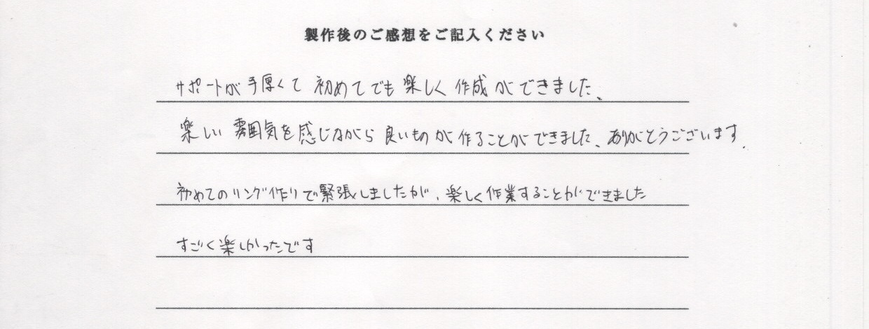 楽しい雰囲気を感じながら良いものが作ることができました。ありがとうございます。初めてのリング作りで緊張しましたが、楽しく作業することができました。すごく楽しかったです。