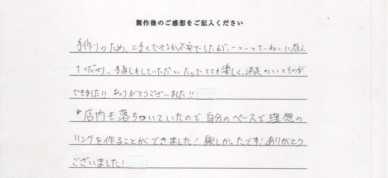 店内も落ち着いていたので自分のペースで理想のリングを作ることができました!楽しかったです!ありがとうございました!