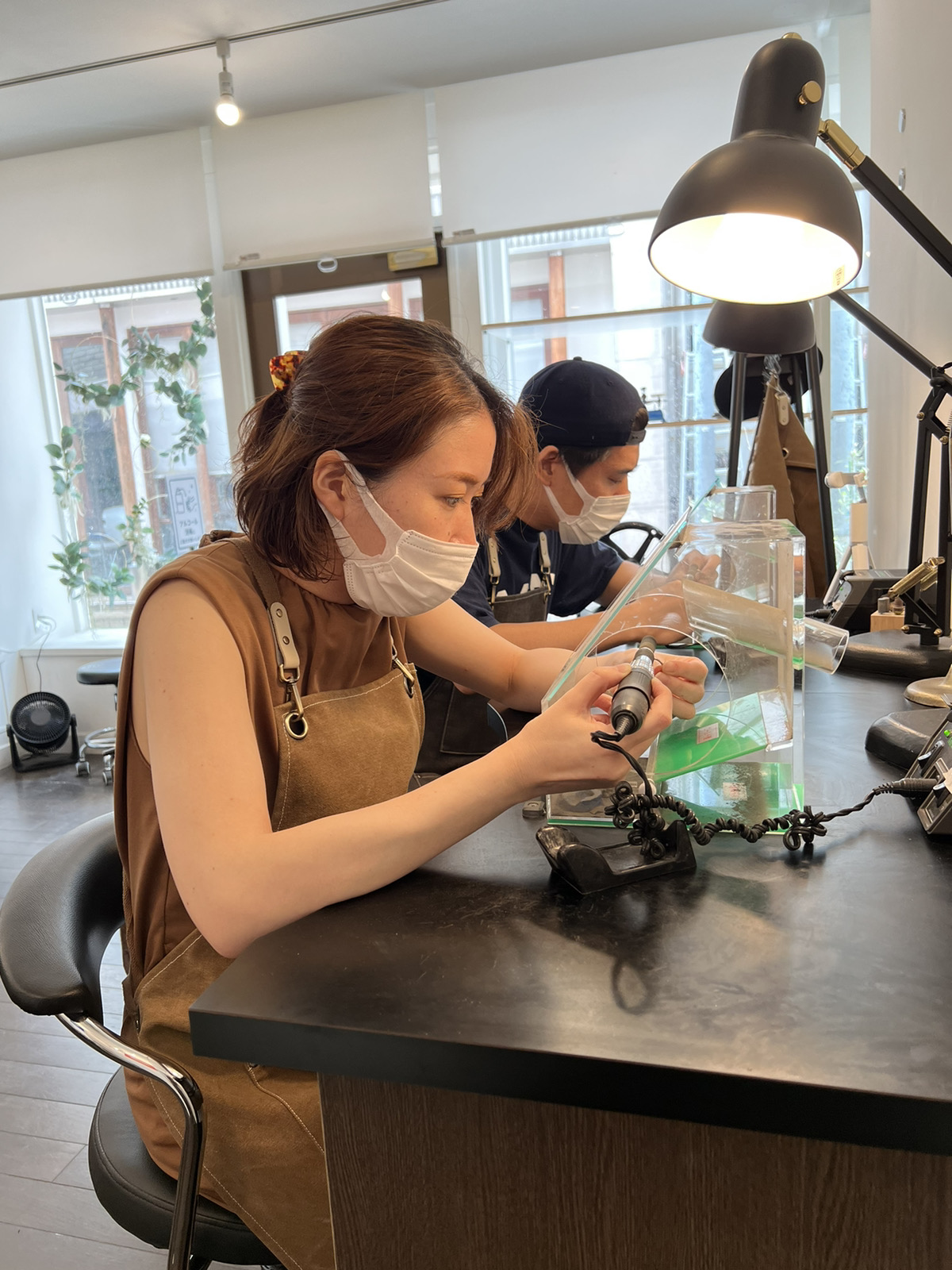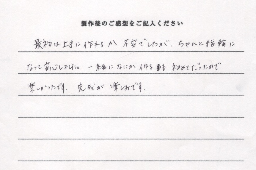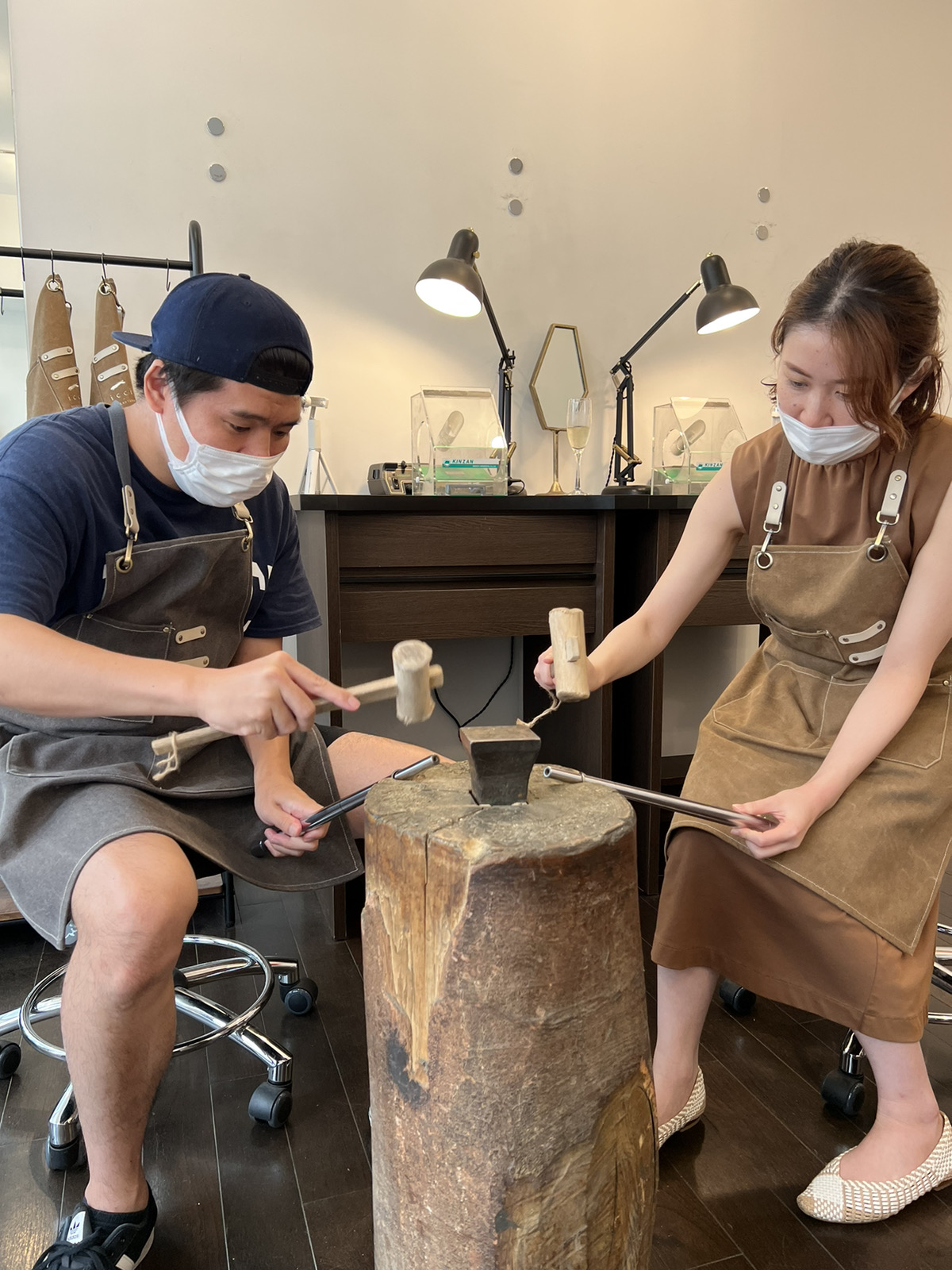 終始笑顔のお二人でこちらも一緒に楽しく制作のお手伝いをさせて頂きました!制作されたリングは艶消しマットな仕上がりからハンマー打ちをすることにより、マットと打刻による艶のコントラストが絶妙なカッコイイ仕上がりになりました。 ご紹介のアーティストさんに自慢しますとおしゃって頂きました!ありがとうございます♪