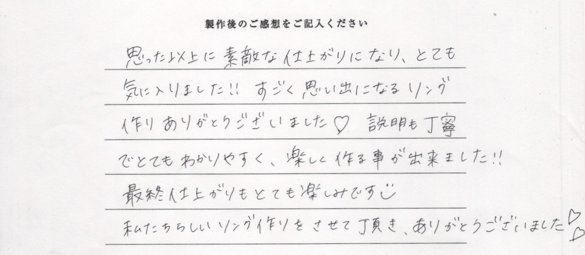 思った以上に素敵な仕上がりになり、とても気に入りました!!すごく思い出になるリング作りありがとうございました!説明も丁寧でとてもわかりやすく、楽しく作る事ができました!!