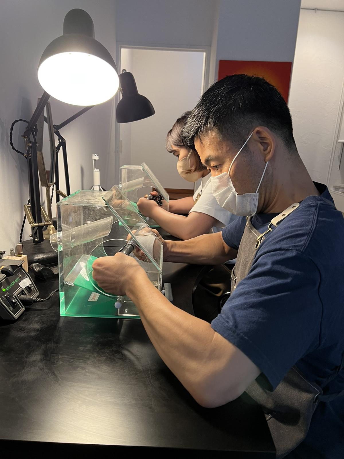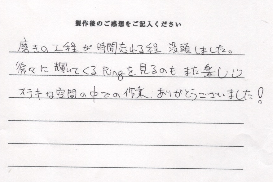 可愛らしい赤ちゃん同伴でご来店頂きました。 既に御入籍は去年されていて少し落ち着いたタイミングで手作り結婚指輪を制作したいとの事でこちらも気合い入れてお手伝いさせて頂きました! お二人の制作中ベビーカーを押しながら店内をぐるぐる回るくらいしか出来ませんでしたが。 とても綺麗に仕上がったリングに幸せいっぱいのメッセージ刻印とカラーダイヤモンドを留めて完成! ありがとうございました。