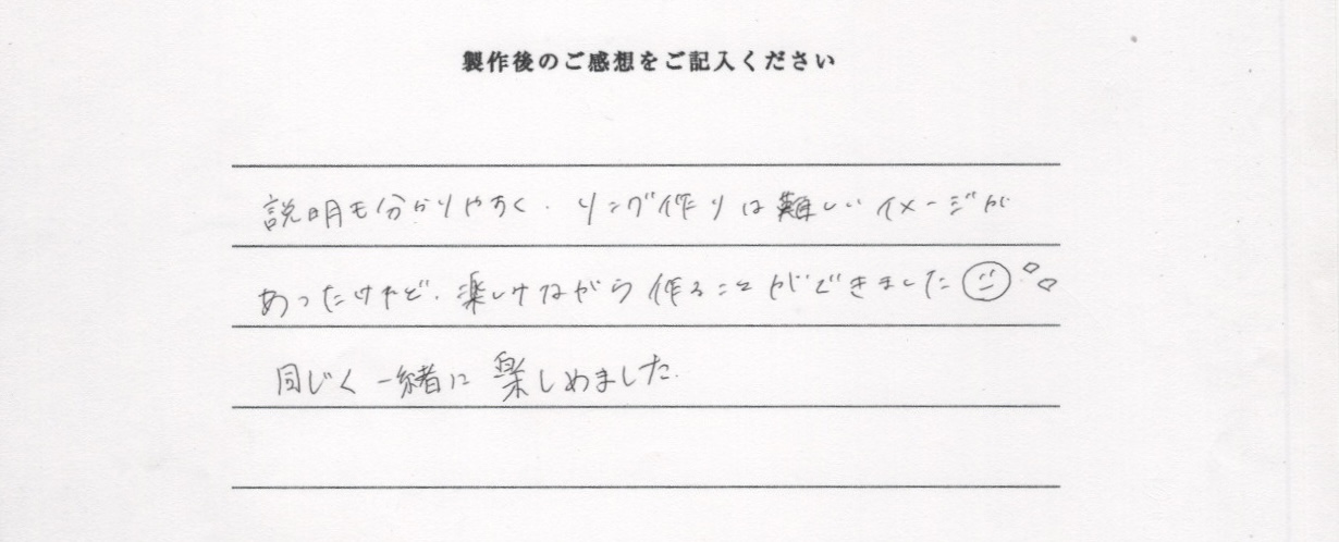説明も分かりやすく、リング作りは難しいイメージがあったけれど、楽しみながら作るおとができました!