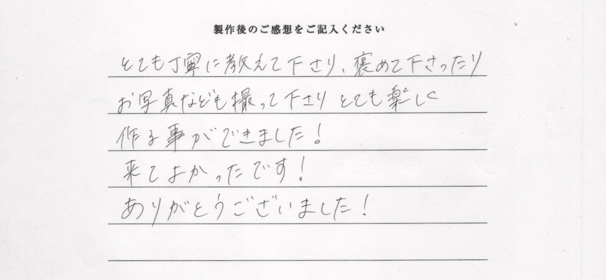 楽しく制作していただけたようで何よりです。来て良かったとおしゃっていただいて大変嬉しく、励みになります。機会がありましたら、是非また違うデザインのものを作りにいらしてください。