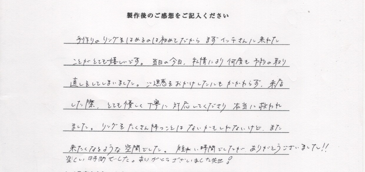 手作りのリングをはめるのは初めてだからまずイッチさんに来れたことがとても嬉しいです。当日の今日、私情により何度も予約の取り直しをしてしまいました。ご迷惑をおかけしたにもかかわたず、来店した際、とても優しく丁寧に対応してくださり本当に救われました。リングをたくさん持つことはないかもしれないけど、また来たくなるような空間でした。短い時間でしたがありがとうございました‼︎