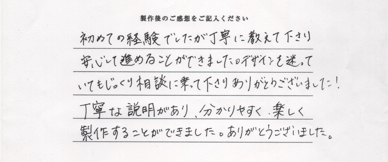 丁寧ね説明があり、分かりやすく、楽しく製作することができました。ありがとうございました。