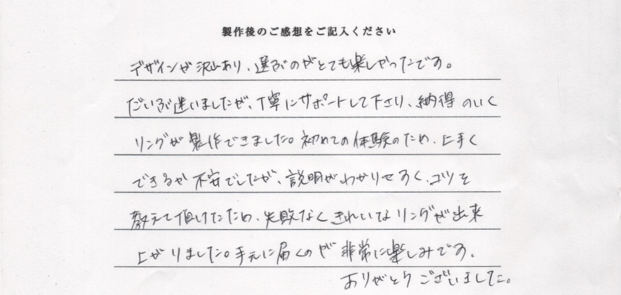 だいぶ迷いましたが、丁寧にサポートして下さり、納得のいくリングが製作できました。