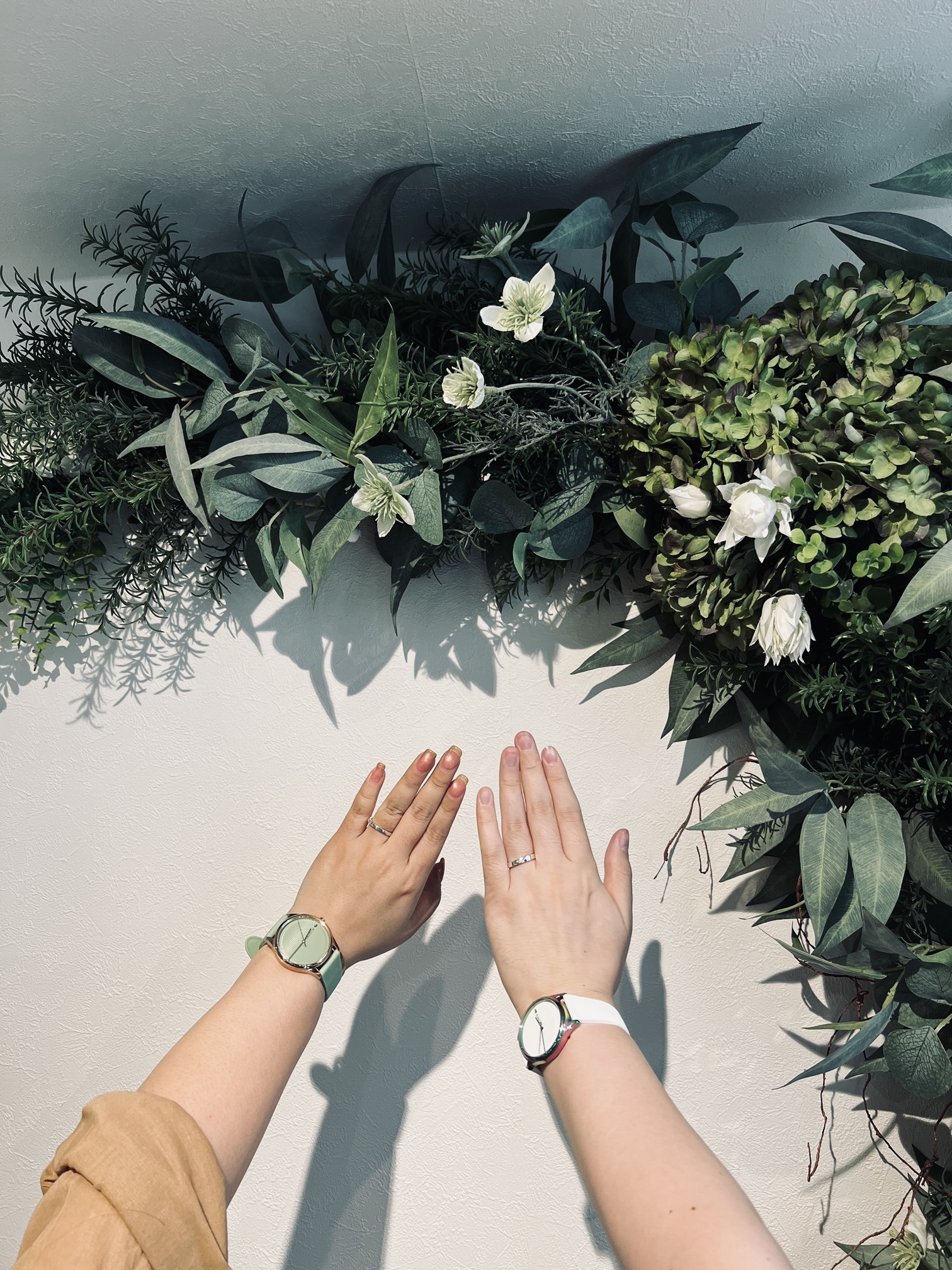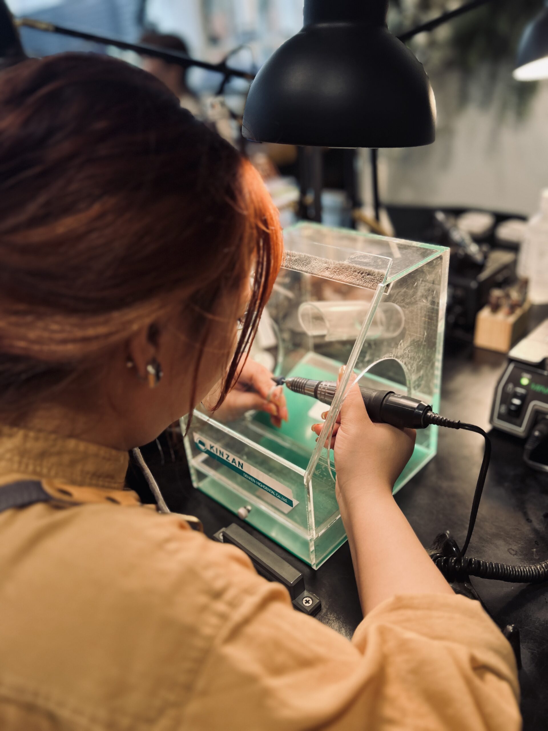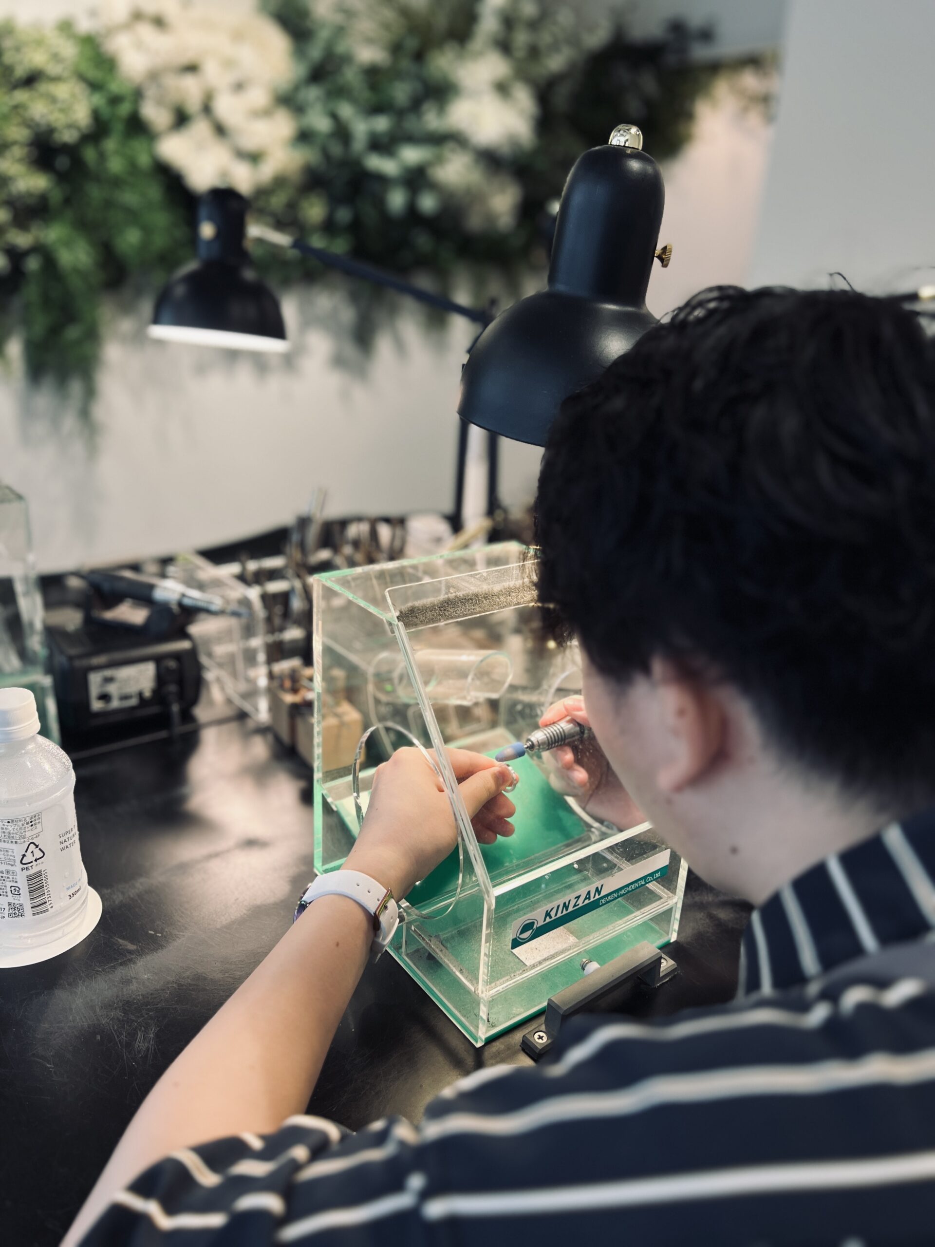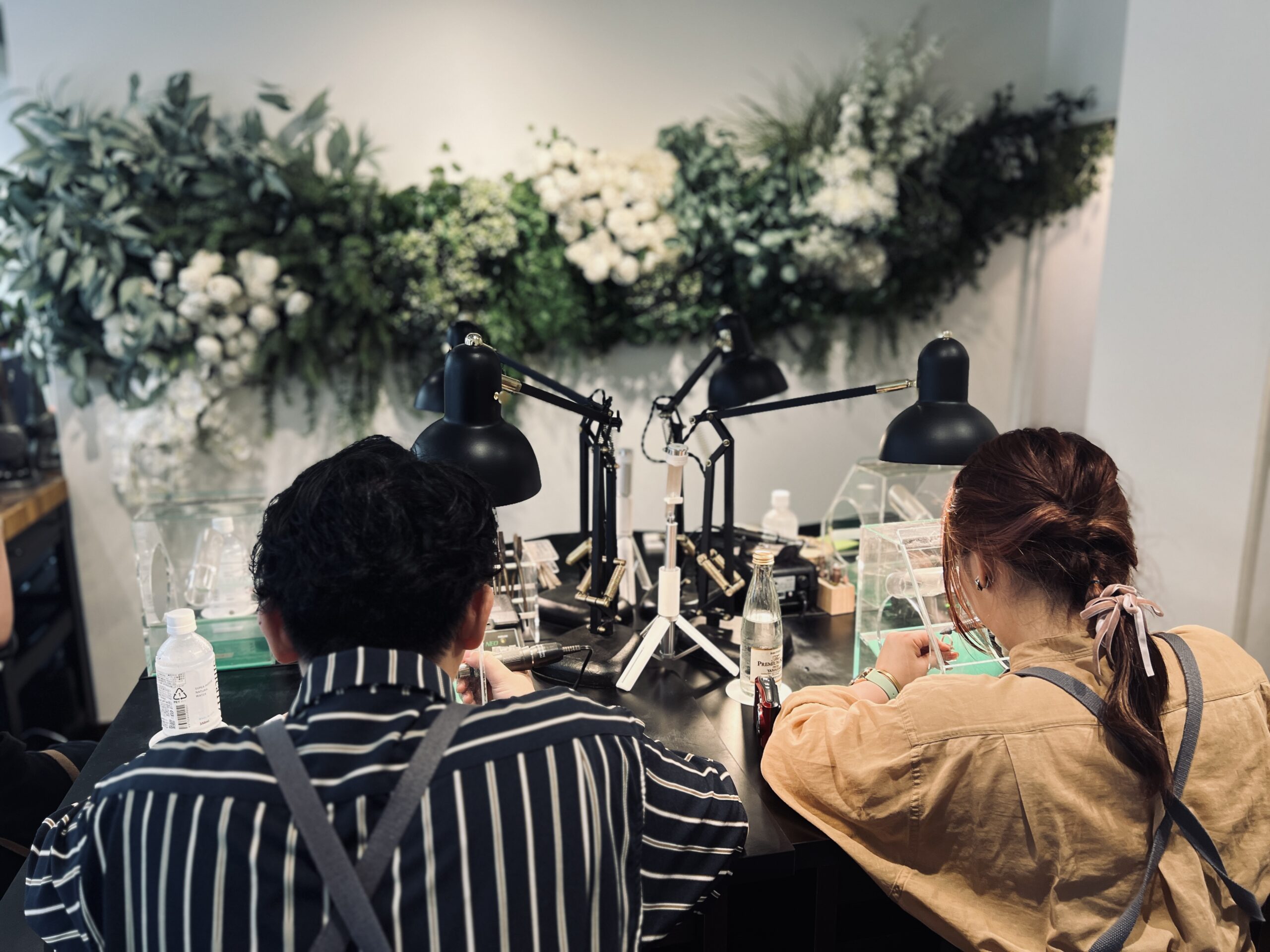 とても楽しそうに制作をしていただいていたのが印象的でした。形はお揃いで、カラーリングはそれぞれ似合う色を選ばれ、仕上がりがこちらも楽しみです。おふたりで作られたリングを是非ご愛用くださいませ。