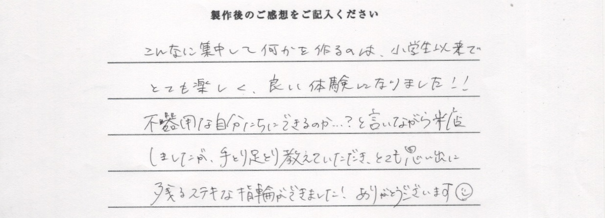 不器用な自分たちにできるのか…?と言いながら来店しましたが、手取り足取りおしえていただき、とても思い出に残るステキな指輪ができました!ありがとうございます!