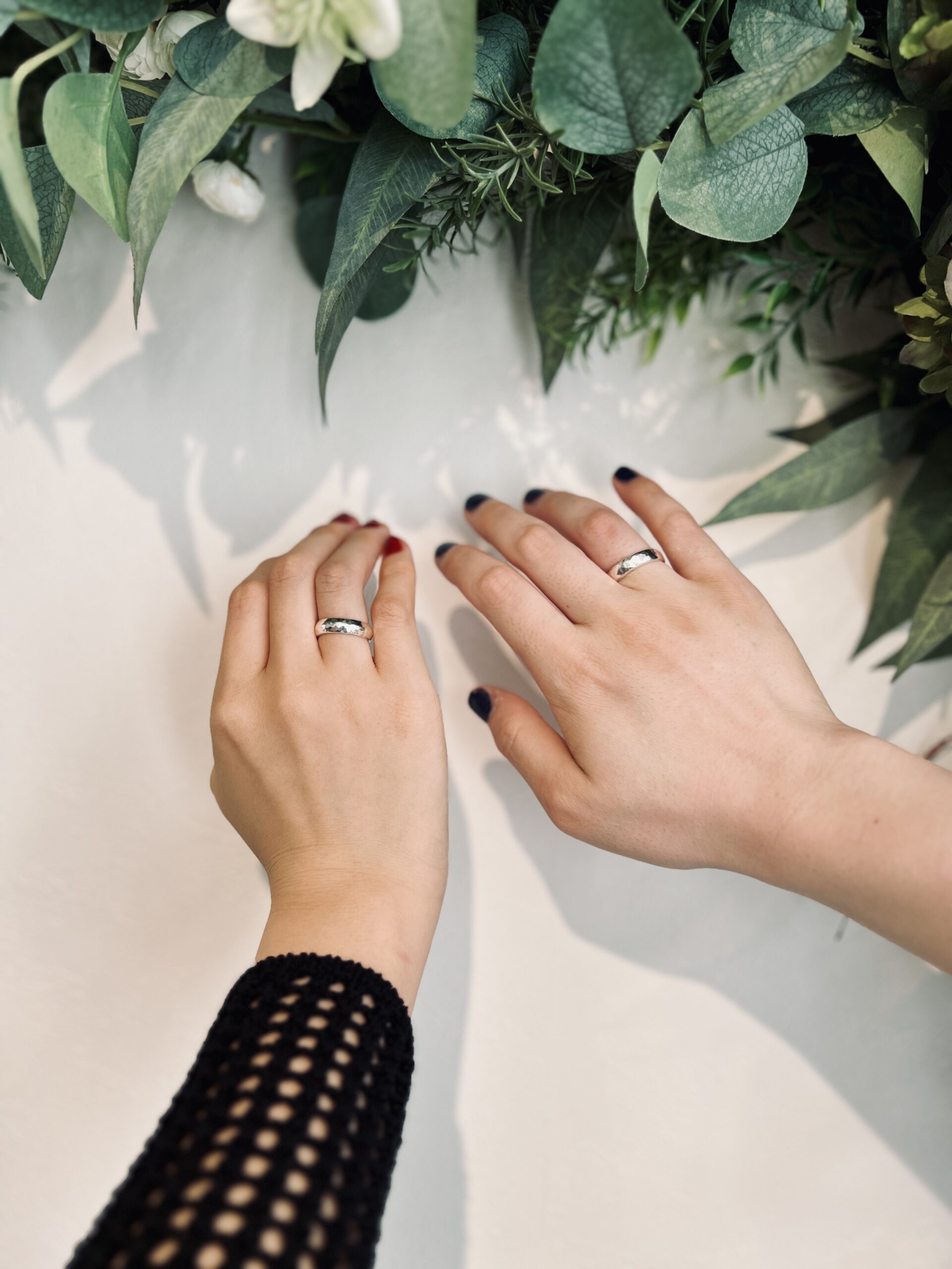 5mm幅の甲丸リングにハンマー模様を入れるデザインをお選びいただきました。叩く人によってデザインがガラッと変わりますので、世界にひとつだけの特別なリングに仕上がりましたね。