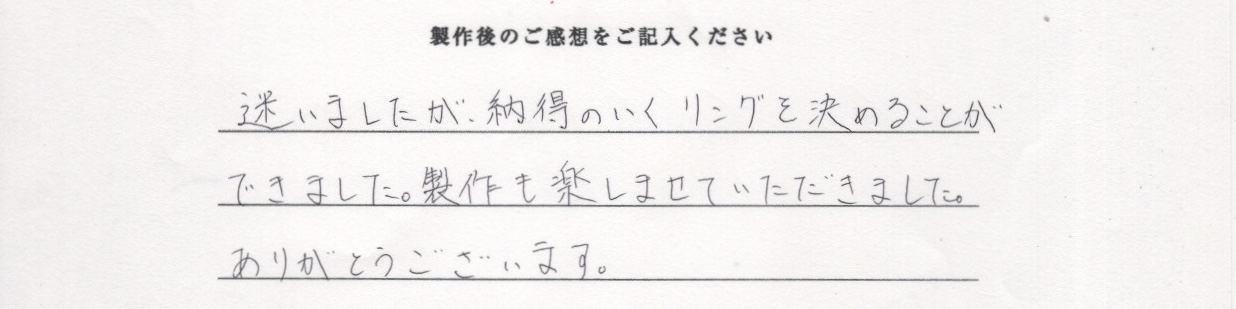 迷いましたが、納得のいくリングを決めることができました。制作も楽しませていただきました。ありがとうございます。