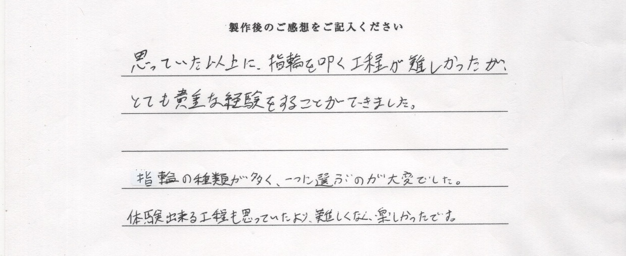 思っていた以上に、指輪を叩く工程が難しかったが、とても貴重な経験をすることができました。