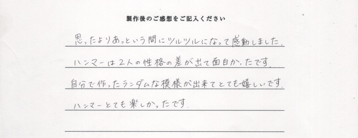デザインをどれにするか悩まれていましたが、お好みのものを選んでいただき思い入れのある指輪になったかと思います。制作も楽しんでいただけたようで嬉しいです。