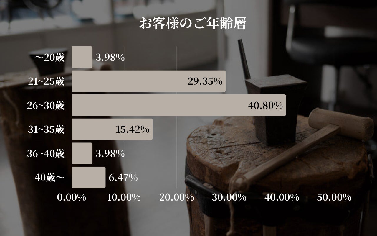 調査結果によると、顧客の中心層は「26〜30歳」で全体の40.80%を占め、次いで「21〜25歳」が29.35%と、20代が約70%を占めています。一方、「31〜35歳」は15.42%、「36〜40歳」と「〜20歳」はそれぞれ3.98%、「40歳以上」は6.47%と低い割合です。