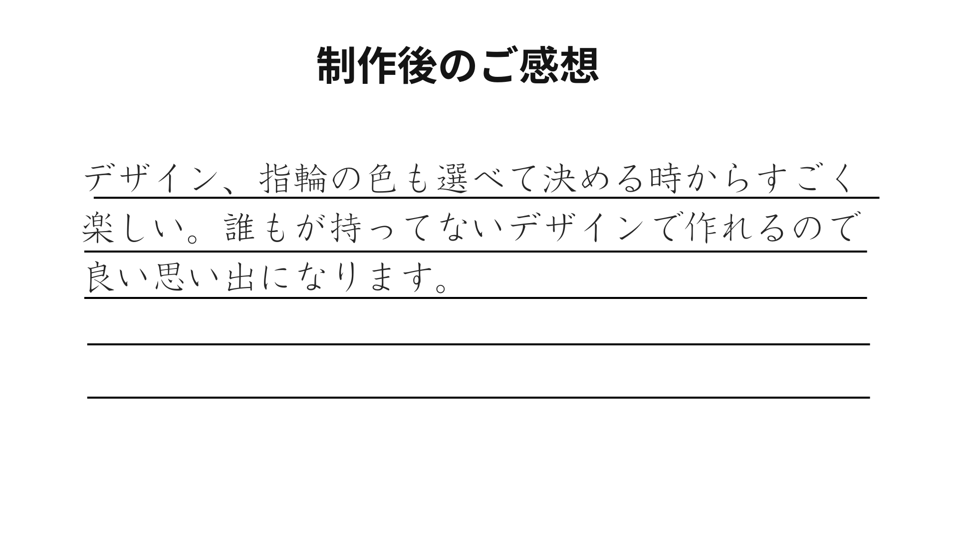 デザインや指輪の色をお選びいただく段階からお楽しみいただけたこと、「誰もが持っていないデザイン」で特別な思い出をご体験いただけたこと、大変嬉しく存じます。
