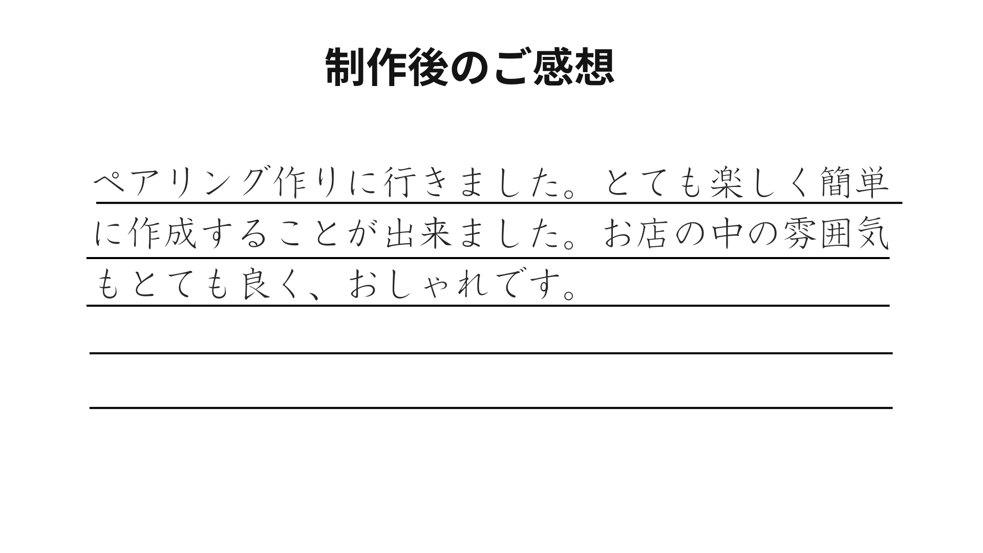 楽しく簡単に制作できたとのお言葉や、お店の雰囲気をおしゃれと感じていただけたこと、大変嬉しく存じます。